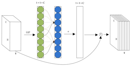 Accordingly, the model could add the attention mechanism module after the respective down-sampled convolution module. First, the binary adaptive mean method was adopted to calculate and pool the input data to a size of 1 × 1. After the global average pooling, the 1D convolution with weight sharing characteristics was exploited to capture the cross-channel interaction information. Next, the nonlinear relation was introduced through the sigmoid activation function. Lastly, the result was multiplied by elements and then expanded into the same dimension as the input data, so the dimension of the data processed by the attention mechanism module remained unchanged. By introducing the attention module, the accuracy of semantic segmentation tasks was significantly improved. Figure 8 presents the attention mechanism module.