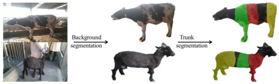 In this study, two experienced technicians used the LabelImg Annotation Tool (Version 1.8.6) based on PyTorch framework (Version 1.5.0) to manually annotate the characteristic parts of the color images in the data set. The labels include the torso and feature points of cattle and goats. The LabelImg annotated the target object in the original image, and then a JSON file was created for the annotated image. The semantic segmentation model was used to segment the feature parts of cattle and goats, and the edge contour and feature points were extracted from the local image of the feature parts.