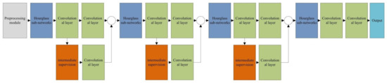 The multistage densely stacked hourglass network refers to a serial stack of hourglass sub-networks; however, with the increase in the network depth, the parameters increased, making it difficult to perform effective training updates. To solve such a problem, this study adopted the relay supervision strategy in the model for the supervised training. The experiments in this study were all performed on a three-stage stacked hourglass network. Figure 12 gives the four-level densely stacked hourglass network.
