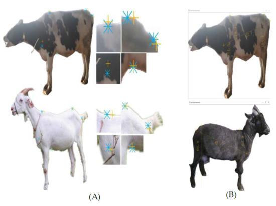 For pigs, Wang et al. [13] and Shi et al. [14] used random sample consensus to remove the background point cloud, and the body measurements were acquired by calculating the integral length of the curve. For cattle, Salau et al. [12] manually marked the feature points and calculated the cattle body size with the Cartesian coordinates. The feature point marking method was then optimized by Ruchay et al. [15]; the filters were used to remove the noises in the depth map and marked feature points in cattle. For goats, Lina et al. [16] detected the feature points by finding the convex to calculate the goat’s body size. Guo et al. [17,18] developed the LSSA_CAU system to measure the body sizes of pigs, horses and cattle in their respective scenes, exploiting the unevenness of the first derivative of the point cloud curve to find the feature points of livestock; however, all the above research on livestock body size measurement analyzed a single livestock species in a specific scene, and the measurement accuracy was greatly influenced by illumination, background and livestock species, and therefore it does not have wide application value.