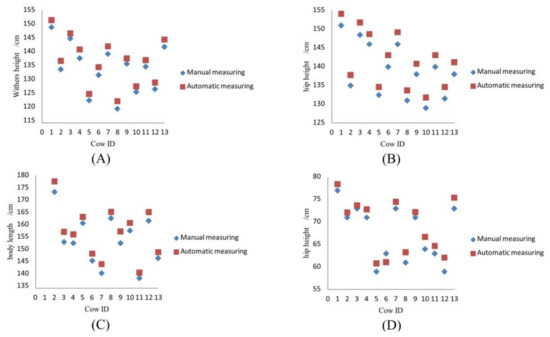 According to Figure 15 and Figure 16, most automatic measurement results were greater than the manual measurement results. Given the Biltmore stick clings to livestock torso and less affected by the livestock fur during manual measurements, the livestock fur greatly affected the background segmentation and the feature point location. The method located feature points were close to fur of the livestock, but not close to body. The result of the automatic measurement was slightly greater than that of the manual measurement.