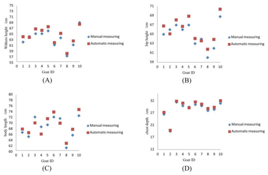 Comparison of manual measurement and the proposed method for the four different goat body parameters: (A) Withers height, (B) hip height, (C) body length and (D) chest depth.