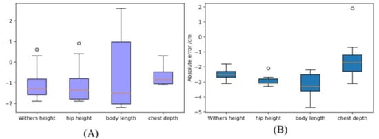 Box plots of the absolute error: (A) Box plots of the absolute error of the measurement of the cattle body size; (B) Box plots of the absolute error of the measurement of the goat body size.