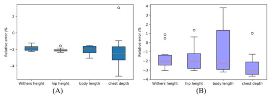 Box plots of relative error: (A) Box plots of the relative error the measurement of the cattle body size; (B) Box plots of the relative error the measurement of the goat body size.