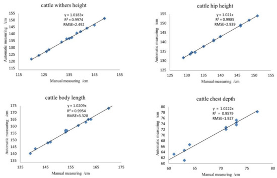 As shown in Figure 19, the coefficient of determination of withers height, hip height body length and chest depth of cattle were 0.9974, 0.9985, 0.9954 and 0.9579, and RMSE were 2.492, 2.939, 3.328 and 1.927, which demonstrated that the two variables had a high degree of explanation. The linear regression coefficient of the cattle body size measured was close to 1, which showed the consistency of automatic measurement with the manual measurement.