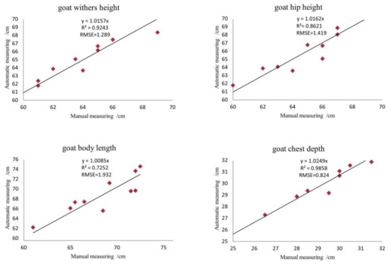 As shown in Figure 20, the coefficient of determination of withers height, hip height body length and chest depth of goats were 0.9974, 0.9985, 0.9954 and 0.9579, and RMSE were 1.289, 1.419, 1.932 and 0.824. The coefficient of determination of automatic measurement was slightly lower than cows. Since goats are smaller than cattle, it is difficult to locate the feature points. In fact, whether it is automatic measurement or manual measurement, when the size of livestock decreases or the bone is unclear, the accuracy of feature point location will decrease [52]; however, the linear regression coefficient of the goats’ body size measured was close to 1, which showed the consistency of two measurement methods.