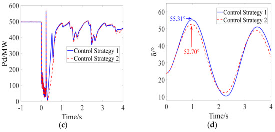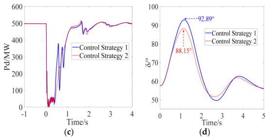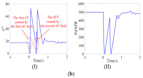 As shown in Figure 14a,d, the occurrence of the AC fault causes the first CF of LCC-HVDC. After the clearance of the AC fault, an SCF occurs when the DC control system adopts CS-1, while the SCF is prevented when the DC control system adopts CS-2, indicating the effectiveness of the proposed control strategy. As shown Figure 14c,d, the transient stability margin of the sending-end power system is increased due to the fact that the severe fluctuation in DC power caused by an SCF is avoided. A comparison with Scenario 1 verified the effectiveness of the proposed control strategy in different scenarios.
