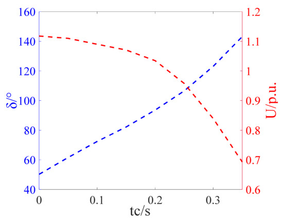 It can be seen from Equations (6)–(8) that the longer the fault lasts, the larger the relative rotor angle of the post-fault receiving-end power system is, and the weaker the support capability of the inverter bus voltage will be, resulting in a higher probability of the occurrence of an SCF. The above conclusions were verified by the AC/DC asynchronous interconnection power system shown in Figure 2. The simulation results are shown in Figure 3.