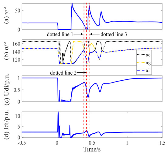 It can be seen from Figure 7b that the DC controllers switch during the recovery. At the first red dotted line, the inverter control system switches from the inverter current controller to the inverter gamma controller. Then, the firing angle of the inverter station begins to decrease. Therefore, the DC voltage of the inverter station decreases, causing an increase in the DC voltage difference between the rectifier side and the inverter side. Meanwhile, the DC current increases quickly within a very short period of time and reaches the maximum value at the second red dotted line. During the period between the first red dotted line and the second red dotted line, the rapid increase in the DC current causes an increase in the reactive power consumption of the inverter station and a decrease in the inverter bus voltage. Then, the DC current begins to decrease with the regulation of the rectifier current controller, while the extinction angle of the inverter station begins to increase as shown in Figure 7a,c,d. At the third red dotted line, the inverter control system switches from the inverter gamma controller to the inverter current controller and finally enters into a normal state of operation with the regulation of the inverter gamma controller.