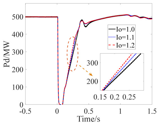 It can be seen from Equation (27) that the recovery speed k of the DC power is proportional to the control parameter Io of the VDCOL, and the DC power recovery speed k can be controlled by modifying Io. As shown in Figure 10, the larger the Io is, the faster the recovery speed of the DC power will be, which conforms to the theoretical analysis.