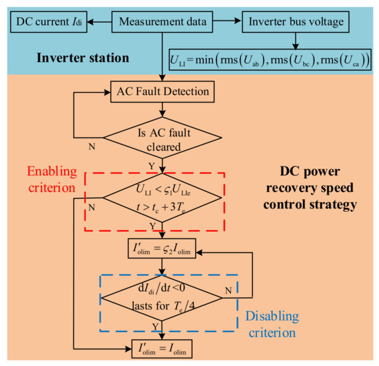 Additionally, in order to avoid the severe fluctuation in the DC power caused by disabling the proposed control strategy, the time at which it is disabled must be carefully selected. As shown in Figure 7, the DC current decreases while the extinction angle increases during the period between the second red dotted line and the third red dotted line, indicating that the risk of an SCF occurring is reduced and the proposed control strategy can be disabled at this time. In addition, if the DC power recovery speed control fails when the DC current begins to decrease, the DC current order Iolim will change from Iolim = ς2Iolim to Iolim = Iolim, which will be larger than the DC current Idi at this time, thereby avoiding the decrease in the DC current Idi and the severe fluctuation in DC power. The disabling criterion is given in Equation (29), and a time window was added to improve the reliability of the proposed disabling criterion.