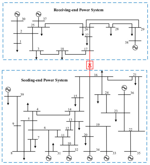 A simulation model of the IEEE 39-bus AC/DC asynchronous interconnection power system was built in the Advanced Digital Power System Simulator (ADPSS) to verify the effectiveness and robustness of the DC power recovery speed control strategy presented in this paper. The network topology is given in Figure 12. The AC transmission lines between Bus-1 and Bus-39, and between Bus-3 and Bus-4, were cleared. The AC transmission line between Bus-16 and Bus-17 was replaced by LCC-HVDC, where Bus-16 is the rectifier station bus and Bus-17 is the inverter station bus. The ADPSS was developed by the Chinese Electric Power Research Institute [30] and includes an electromechanical transient simulation module (Power System Analysis Software Package, PSASP) and an electromagnetic transient simulation module (Electromagnetic Transient Simulator for DC and AC power systems, ETSDAC) [31].