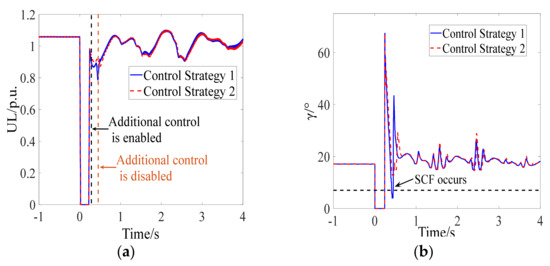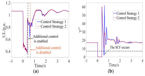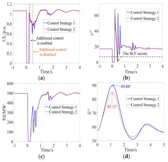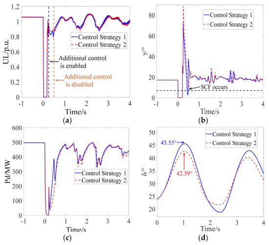 The inverter bus voltage, extinction angle, DC power, and relative rotor angle of the sending-end power system are shown in Figure 13a–d. The occurrence of the AC fault causes the first CF of LCC-HVDC. After the clearance of the AC fault, it can be seen from the blue solid line in Figure 13a that the post-fault voltage of the inverter bus decreases rapidly and to a great extent, which indicates that the transient stability of the post-fault receiving-end power system has seriously deteriorated. The SCF (the blue solid line shown in Figure 13b) occurs during the recovery when the DC control system adopts CS-1, demonstrating the correctness of the mechanism analysis of SCFs as affected by transient stability. Moreover, it can be seen from the red dotted line that the SCF is effectively prevented during the recovery when the DC control system adopts CS-2. In CS-2, the proposed control strategy is adopted as an additional form of control. The additional control (the red dotted line shown in Figure 13a) is enabled when Equation (20) is satisfied, while the DC power recovery speed is limited by modifying the output DC current order Iolim to Iolim = ς2Iolim, so that the occurrence of the SCF is prevented. Then, the additional control is disabled based on Equation (29). Due to the occurrence of the SCF, it can be seen from the blue solid line in Figure 13c that the DC power fluctuates seriously during the recovery. When the proposed control strategy is employed, the recovery characteristic of the DC power is improved, which increases the transient stability margin of the sending-end power system as shown in Figure 13d. The effectiveness of the proposed control strategy is confirmed by the simulation results.