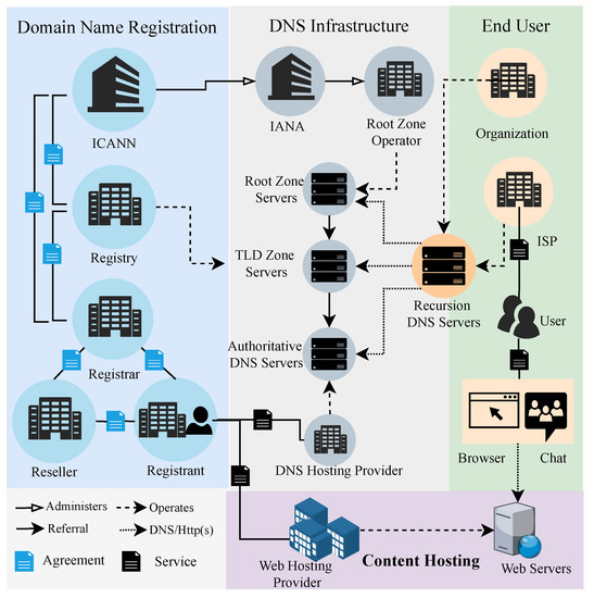 The Internet is a worldwide distributed network comprised of numerous autonomous networks connected voluntarily. It is governed by a decentralized and international multistakeholder network of interconnected autonomous groups comprised of civil society, business, government, academia, research, and national and international organizations. They work together across their different jobs to develop policies and standards that keep the Internet working worldwide for the public good. As a result, this architecture leads to many infrastructures and entities involved in the Internet for end-users to access the services (e.g., websites and email) provided by domain names, as illustrated in Figure 1.