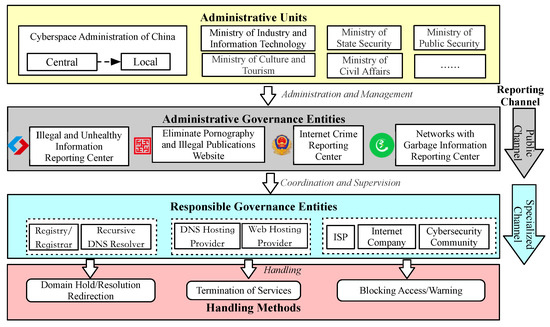 Under multiple Chinese laws and regulations, one or more administrative units jointly establish multiple administrative governance entities based on their responsibilities. These administrative governance entities do not have actual control over the network. However, they are mainly responsible for receiving complaints from the public or organizations and jointly handling and monitoring abusive domains with various responsible governance entities. The responsible governance entity is the Internet entity in the DNS ecosystem that we introduced in Section 2.1.2. Internet entities have the real ability and responsibility to deal with abusive domains within their jurisdiction.