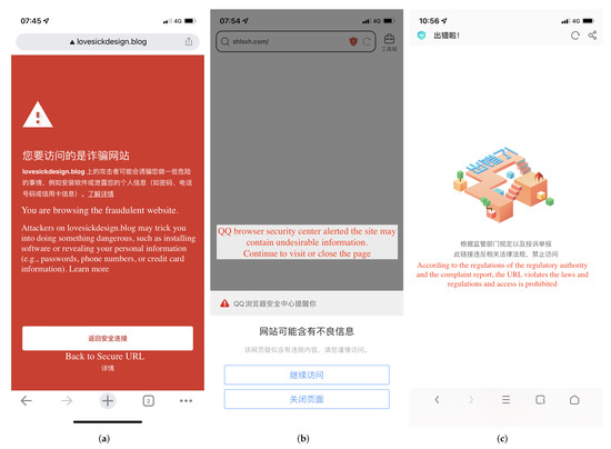 Browsers warn or block users from accessing abusive domains. (a) Google Chrome. (b) Tencent QQ Browser. (c) UC Browser.