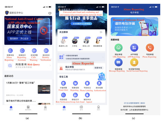 Reporting platform in the form of an App. (a) National Anti-Fraud Center. (b) Beijing Anti-Fraud Center. (c) Shandong Anti-Fraud Center.
