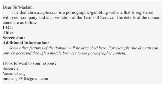 We prefer the reporting platform if the entity gives it; otherwise, we use the email provided by the entity to report abuse. For instance, Figure 6 illustrates the template we use when reporting the registrar of domain name abuse; the details of the reported abuse for each entity we present in Section 5.