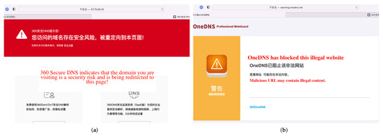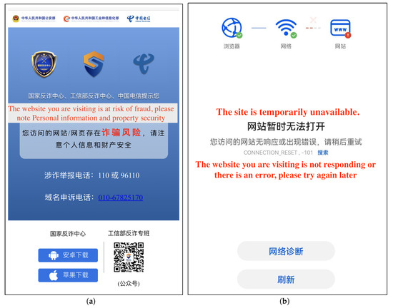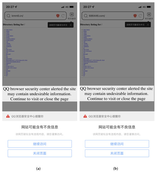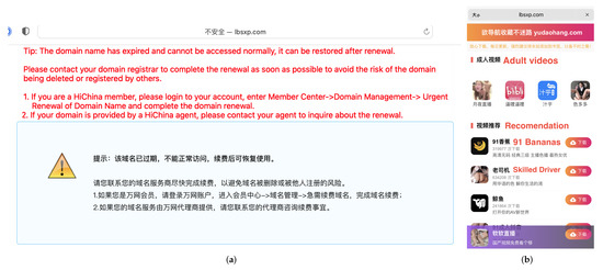 Figure 15. Using browsers of different platforms to access the same abusive domain name. (a) MacBook Safari. (b) iPhone Safari.