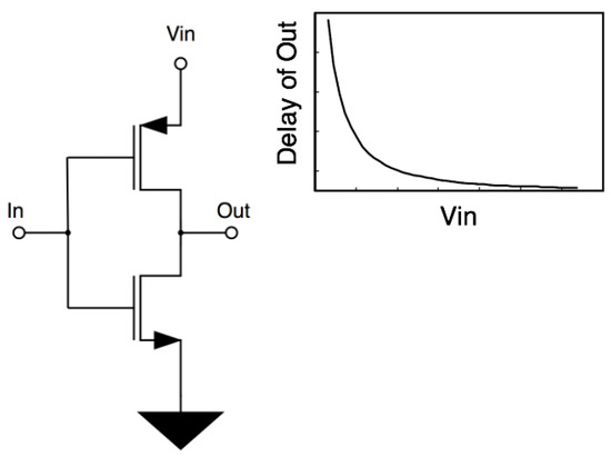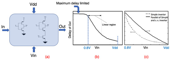 Several works can be found in the literature focused on techniques to linearize the characteristics [15,16,17,18,19]. Indeed, the linearity of VCDUs is important because it defines the dynamic range of the TMSP circuits that follow. In [15], a new delay element is proposed. As shown in Figure 4, this delay element is composed of two inverters. The first inverter is a simple inverter, whereas the second one is a current-starved inverter. The two inverters are connected in parallel (see Figure 4a): the delay of the first inverter is fixed and the delay of the second inverter is a function of the controlling voltage, which is in this case. In this architecture, thanks to the use of the first inverter with a fixed delay, the maximum delay is limited (see Figure 4b). As a consequence, the linearity is improved because for low , the delay does not abruptly increase: moreover, by sizing the current starved nmos to obtain a high resistance, the linear region can be wider, but still not rail to rail, as highlighted in Figure 4c. The circuit proposed in [15] has a power supply of 1.8 V and its linearity ranges between 0.8 V and 1.8 V.