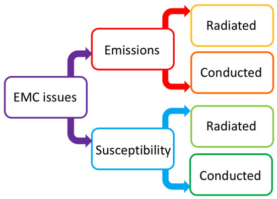Another issue in practically all electronic circuits is the susceptibility to electromagnetic interferences (EMI). EMI effects may indeed involve any electrical or electronic equipment. As an example, aircrafts are especially susceptible to radiated and conducted interferences; in automotives, engines may stall because of the interference induced by traffic lights and cellular telephone transmitters can induce disturbances in braking systems (ABS). In general, as shown in Figure 2, electromagnetic compatibility issues can be divided into two parts: emissions and susceptibility. Both of these should be as low as possible. On the other hand, high emissions are generally caused by high frequencies and high power systems, for example, as in the case of switching converters and motors while the susceptibility is a critical issue in practically all circuits. The integrated circuit ICs can be victim of conducted interferences: indeed, considering their small sizes, ICs are typically not disturbed by radiated EMI, as their on-chip interconnections are excessively small to function as effective antennas. They are, however, subjected to conducted interference which is received by the printed circuit board (PCB) tracks to which they are connected. Conducted EMI can be injected through the I/O pins generally causing two harmful effects: nonlinear distortion and EMI-induced DC bias shift, which can eventually lead to failures [10,11,12]. This is particularly critical in analog ICs but the effect of conducted EMI has also recently been investigated in digital subsystems, and especially in those emulating analog functions such as in digitally based amplifiers or in time-mode circuits. The latter can indeed be susceptible to interferences. In particular, in the voltage-controlled delay unit, the effect of interferences is a strong variation of the delay, which can be named EMI-induced jitter [13,14].