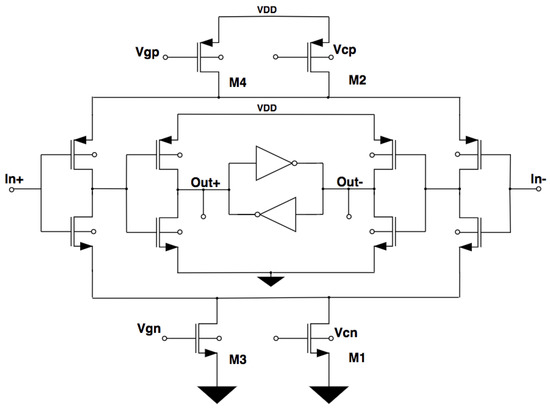 In [16], a Modified Pseudo Differential Current-Starved Delay Element (MPDCSDE) is used to realize a delay cell. The proposed delay cell is shown in Figure 5. Each branch of the delay cell is implemented as a two-stage inverter. All the bulk of the pmos transistor is biased towards Vcp, while the bulk of nmos transistors is biased towards Vcn; the gates of the pmos devices are at Vgp and the gates of the nmos devices are at Vgn, except for the transistors connected to the input or to the output. M1 is the pull-down while M2 is the pull-up transistor. The control voltages Vcn and Vcp, respectively, modulate the ON resistance of the devices M1 and M2. These variable resistances control the current available to the charge or discharge the load capacitance of the first inverter. Moreover, the body bias technique is utilized to widen the applicable range for the controlled signal and improve the linearity. This circuit is powered at 1.5 V and shows a linear behavior for control voltages ranging from 0.2 V to 1.2 V. Therefore, although the linearity range is largely increased, this topology does not show a real rail-to-rail linear characteristic.