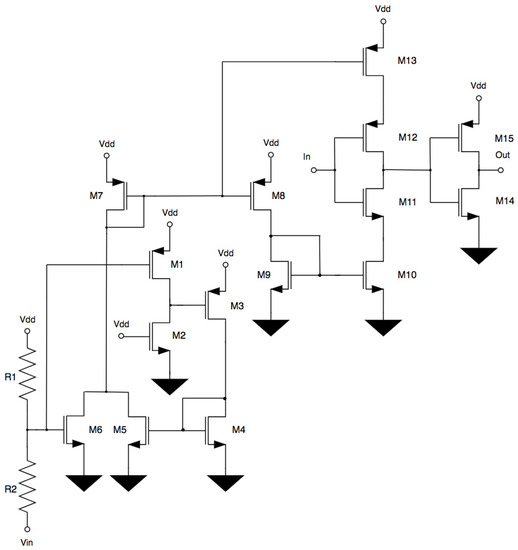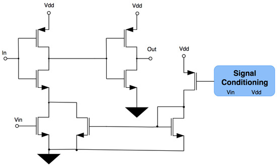 The core of the VCDU is the signal conditioning circuit based on a resistor voltage divider and a mos level shifter. These devices are added to improve the linearity of the VCDU. Without the signal conditioner, indeed, for low-input voltage, the current-starved nmos transistor enters the subthreshold region, causing strong nonlinearity. Overall, the VCDU proposed in [17] has a voltage supply of 1.8 V and a linear range from 0 up to 1.2 V. The VCDU proposed in [18] and shown in Figure 7 is still based on a signal conditioning circuit, but in this case, the circuit is different both in the schematic and in working principle. The conditioning circuit is indeed based on a simple inverting common-source amplifier, with the pmos input device (controlled by Vin) and nmos active load (biased at Vdd); this stage helps in obtaining a quasi-linear monotonic relationship in the delay response of the circuit. However, transistor sizing optimization must be performed by means of a parametric sweep in order to obtain the most linear voltage–delay characteristic: the circuit is therefore simple in the schematic but sensible to process variation.