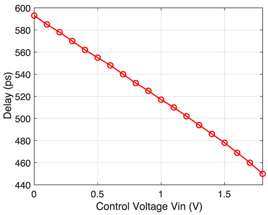 This was designed with the objective of improving the linearity range and at the same time to increase the flexibility of the delay element. Indeed, in the novel VCDU, the rising and falling transient of the output voltage are symmetrical and the voltage-to-time gain of the cell can be easily modified by means of the components’ sizes. The proposed VCDU is based on the architecture suggested in [18] which has been further modified and improved to achieve a very wide linearity range and a higher robustness against process variations by combining the ideas of the signal conditioning circuit proposed in [17]. The delay of the output (Vout) with respect to the input signal (In) is controlled by a voltage obtained from a resistive voltage divider between the control voltage (Vin) and the power supply (1.8 V), as visible in Figure 8. The voltage divider therefore acts as a level shifter. As such, the control voltage is always higher than the threshold voltage Vtn, preventing the transistor M4-M6 entering the subthreshold region. Indeed, as shown in the literature, when transistors enter the subthreshold region, they cause significant distortion and therefore linearity issues. To this aim, the value of the resistors must be chosen to obtain the proper control voltage. Then, the value of the resistors will be a compromise between power and area consumption. Nevertheless, it is worth adding that a precise value of them is not mandatory because the circuit is not affected by the mismatch of the components. The proposed VCDU was designed in a standard 1.8 V 180 nm CMOS process which is proprietary to the United Microelectronics Corporation (UMC) and the circuit extracted from the layout was deeply simulated and characterized using the Cadence tool named Virtuoso, which is available from the Design Kit. The gain, meaning the delay versus the control voltage, has an absolute value of 82 ps/V. The delay unit exhibits good linearity in the maximum voltage range, which is rail to rail, from 0 to 1.8 V of the control voltage Vin, as shown in Figure 9. This is also evident from the linear regression and from the linearity error, which is less than 10−3 in practically all the rail-to-rail range, as can be seen in Figure 10. The components’ mismatch, temperature variations and changes in the voltage supply Vdd affect the delay characteristic of the proposed VCDU but have a negligible effect on the linearity of the circuit. Several plots of the simulations we ran are attached to show the overall performance of the VCDU (see Figure 11, Figure 12 and Figure 13).
