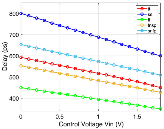 The delay–Vin characteristic of the proposed VCDU using typical (tt), slow (ss), fast (ff) and fast-n slow-p (fs), slow-n fast-p (sf) transistor models.