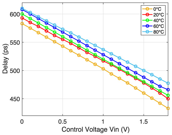 The delay–Vin characteristic of the proposed VCDU at different temperatures from 0 °C to 80 °C.