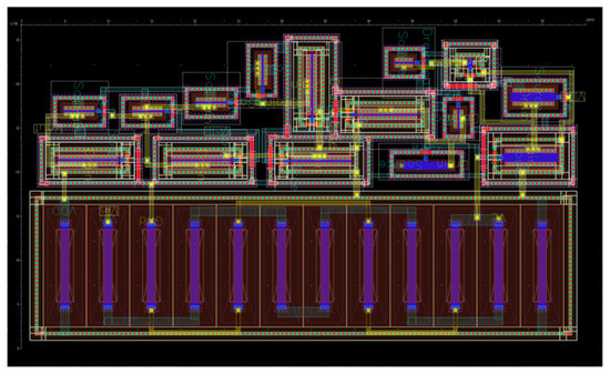 Finally, for the sake of completeness, the overall sizing of the circuits is listed in Table 2 and the layout is shown in Figure 14: the area is 37 μm × 65 μm.