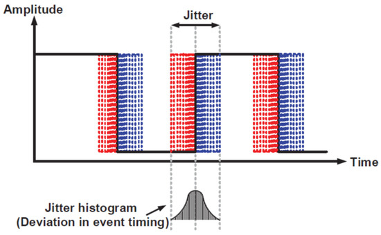 It has recently been demonstrated that the effect of the electromagnetic interferences can affect a generic VCDU as well as the voltage-to-time converter (VTC) based on VCDU [13,14]. The interferences can indeed reach the devices through the I/O pins and they can eventually lead to failures [10,11,12] in a generic-integrated circuit; in the case of time-mode circuits, the interfering signal can cause, in particular, an EMI-induced jitter, as illustrated in Figure 15.