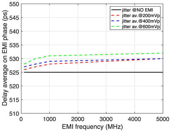 To investigate the EMI effect in the proposed VCDU, several (time-consuming) transient simulations are performed on the circuit extracted from the layout using the Cadence tool named Virtuoso, available from the Design Kit. In particular, the control voltage Vin, which is set to 0.9 V DC, is simulated as affected by an 0DC mean value sinusoidal signal with an amplitude ranging from 200 mVp up to 600 mVp and a frequency set at 100 MHz, 500 MHz, 1 GHz and 5 GHz (because several simulations show that the worst case is right between hundreds of MHz until GHz [10,11]). The initial phase of the EMI is swept from 0° to 340° and the average EMI-induced jitter is calculated and plotted in Figure 16 because it is an interesting and important way to quantify the EMI susceptibility of the circuit, as suggested in the most recent literature about this topic [13]. Due to interferences, the delay moves only slightly away from the nominal condition (525 ps, represented by the black solid line in Figure 16) and the proposed VCDU exhibits a small average EMI-induced jitter: this depends on both the EMI amplitude and the frequencies, but it is always limited to approximately 1% of the nominal delay.