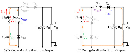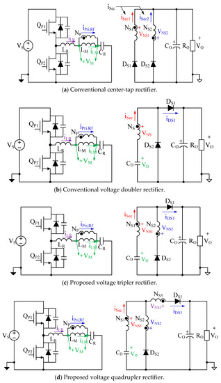 On the other hand, Figure 1c and Figure 1d show the proposed voltage tripler and quadrupler, respectively, and Figure 2 shows their operational modes. To achieve higher I/O voltage gain, the proposed rectifier has new secondary windings from the VDR.
