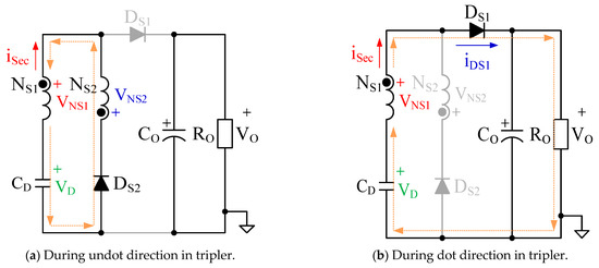 In the proposed tripler rectifier, if the secondary current (iSec) reflected from the primary flows in the secondary dot direction, DS1 is conducted and DS2 is blocked. Since VD is 2VO/3, the voltage (VNS1) across NS1 is VO/3. Assuming NS1 = NS2, the voltage (VNS2) across NS2 is VO/3 in the dot direction; thus, the voltage stress on DS2 is 4VO/3. Meanwhile, if the secondary current (iSec) reflected from the primary flows in the secondary undot direction, DS2 is conducted and DS1 is blocked. Due to VD = 2VO/3, and assuming NS1 = NS2, the voltage (VNS2) across NS2 is VO/3 in the undot direction by the secondary turns-ratio of the transformer; thus, the voltage stress on DS1 is 2VO/3.