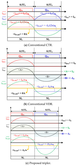 Second, in the VDR, the secondary resonant current, which only flows in the secondary dot direction, is transferred to the output through CD during TS/2, and its average should be the output current (IO). Meanwhile, the secondary resonant current, flowing in the secondary undot direction, does not pass through the output, but through CD and DS2. Due to the current-second balance on CD, its average should be −IO during the undot-direction operation. If the isec is reflected in the primary side of the transformer, each average of the reflected primary current (iPri,Rf) is IO/n or −IO/n during TS/2, as shown in Figure 3b. Due to the current-second balance on the primary resonant capacitor, the transformer magnetizing offset current is also zero in the VDR.