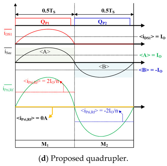 Fourth, in the proposed quadrupler rectifier, the secondary resonant current (iSec = iDS1), which only flows in the secondary dot direction of NS1 and NS3, is transferred to the output through CD and DS1 during TS/2, as shown in Figure 2d, and its average should be the output current (IO), as shown in Figure 3d. Meanwhile, the secondary resonant current, flowing in the secondary undot direction of NS1 and NS2, does not pass through the output, but through CD and DS2, as shown in Figure 2c. Due to the current-second balance on CD, its average should be −IO during the undot-direction operation. If the isec is reflected in the primary side of the transformer, each average of the reflected primary current (iPri,Rf) is 2IO/n or −2IO/n during TS/2, as shown in Figure 3d. Due to the current-second balance on the primary resonant capacitor, the transformer magnetizing offset current is also zero in the proposed quadrupler rectifier.