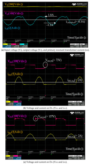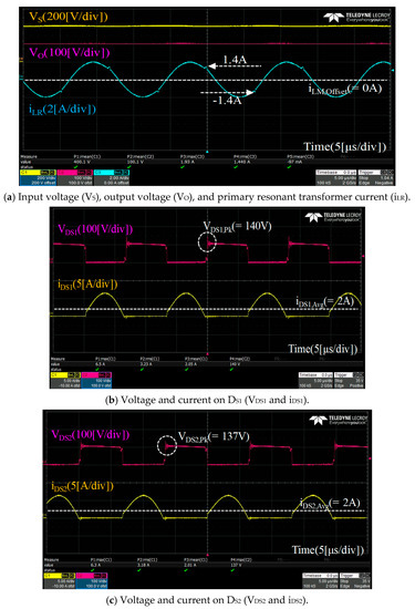 The voltage tripler has asymmetric waveform in the primary current (iLR), due to the magnetizing offset current about 0.33A (= IO/n), as shown in Figure 6a. This results from operations shown in Figure 2a,b. During “undot direction like Figure 2a” and “dot direction like Figure 2b,” −2IO/n and IO/n are on average reflected to the primary side, respectively. In addition, “initial resonant currents” in iLR are different at 1.8 A and −1.2 A, as shown in Figure 6a, due to the magnetizing offset current. This results in “below or above operation” alternatively in a switching period. However, the primary current (iLR) is symmetrical, due to there being no magnetizing offset current in the voltage quadrupler, as shown in Figure 7a. This results from the operations, as shown in Figure 2c,d. During “undot direction like Figure 2c” and “dot direction like Figure 2d,” −2IO/n and 2IO/n are on average reflected to the primary side, respectively. Therefore, iLR in Figure 6a and Figure 7a has different shapes, due to the magnetizing offset current.