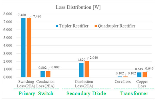 As shown in Figure 8, the voltage tripler has less conduction loss on the secondary diodes (DS1 and DS2). This results from the small forward voltage of V20100C with a 100 V rating, compared with V20150C with a 150 V rating in the voltage quadrupler. Moreover, since the voltage tripler has fewer total secondary turns (16T) than those (18T) of the voltage quadrupler, it has slightly less copper loss in the transformer.