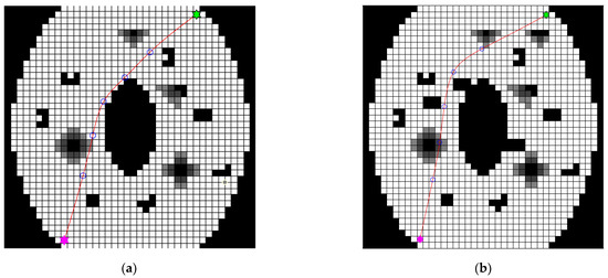 The selection was performed in accordance with the fitness degree . A larger was indicative of larger probability of selecting the individual . The roulette method is generally adopted as the selection principle. The Euclidean distances between two adjacent points, denoted as , were calculated in path planning and accumulated so as to obtain the total path length . The reciprocal of the total length was then calculated as the fitness degree. ,, and could be obtained by Equations (5)–(7), respectively.