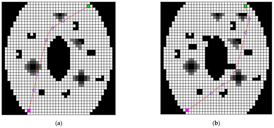 Global path-planning experiments were performed in Map A with a simple environment and Map B with a complex environment using the proposed algorithm. The results are shown in Figure 8. The robot could adequately avoid the barriers in the environment and the regions with weak GPS signal in the environment and achieve favorable global path planning using the proposed algorithm.