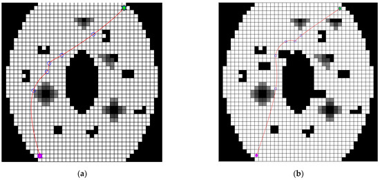 Initialization: The raster map was established according to the surrounding environment and GPS signal strength, in which denotes the maximum number of iterations, denotes the current number of iterations, denotes the initialized gene length (i.e., the path control point), denotes the population number, denotes the initial value of crossover possibility, denotes the initial value of mutation possibility, and denotes the proportion of male parents in the evolution. The initial populations were generated using the PSO algorithm, with global paths from the starting point to the end point.