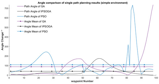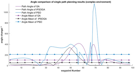 The angle variation curves of the planned paths using three different algorithms were plotted, as shown in Figure 11 and Figure 12. The values were amplified 100 times to highlight the curve tendency. Compared with the traditional GA and PSO algorithm, the proposed algorithm showed great advantages in terms of the mean path angle. Meanwhile, by analyzing the angle curves, the proposed algorithm showed slight variations while the PSO algorithm and traditional GA showed violent angle fluctuations. Using the proposed algorithm, the path angle showed smooth variations, the turning angles varied slightly, and the turning amplitude remained at low levels. In other words, the robot did not need significant turning operations, effectively avoiding dangers and impacts caused by sharp turns. This was consistent with the analysis results of the path.