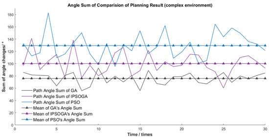 Figure 13 and Figure 14 show the comparison of Angles sum of 30 times path planning result of IPSOGA, GA and PSO in simple environment and complex environment, respectively.