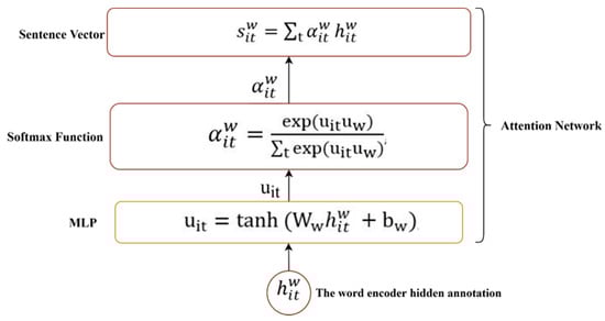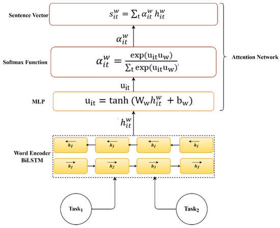 The attention mechanism is also used here to allow the task to learn task-dependent features by rewarding the words that are indicators to classify the sentence accurately. The normalized importance weights of sentences are similarly computed as in Equations (10)–(12). Subsequently, the final sentence vector is produced as the weighted sum of the word annotations.