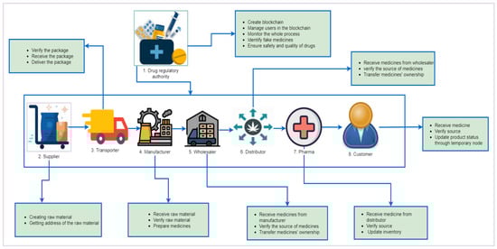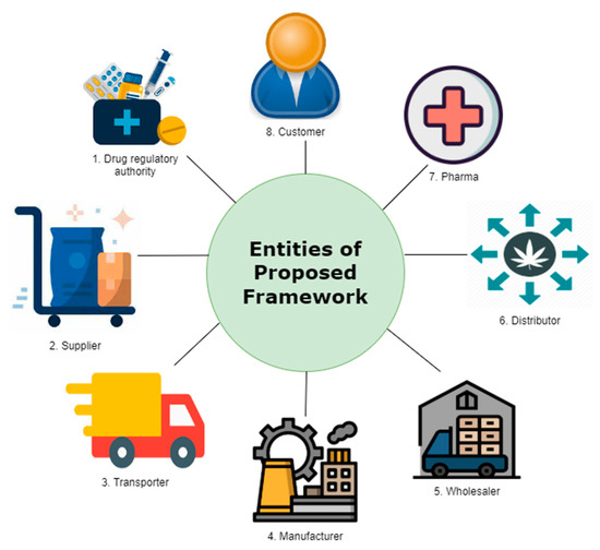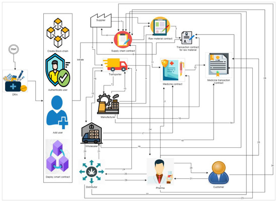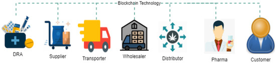 As shown in Figure 1, the proposed framework consists of many entities such as suppliers, transporters, manufacturers, wholesalers, distributors, pharmacists, and customers connected through a decentralized network. Each of these supply-chain entities is a node on the public blockchain. Each of these nodes has its account [36], which is used for representing its identity. DRA will be the owner of the blockchain and will control and monitor end-to-end DDP for ensuring the security and quality of drugs.