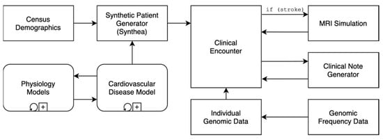 Figure 1 shows how the various data types and models interact to trigger additional data generation and information connections as external additions to Synthea.