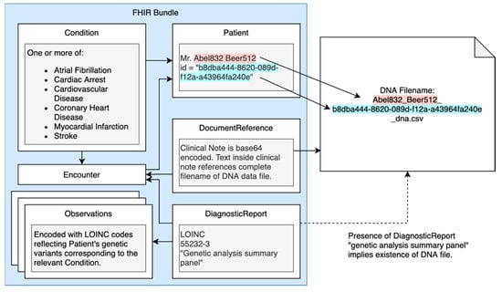 The relationship of FHIR Resources to the synthetic DNA data. A diagnostic report and observations relating to a synthetic genome of the patient are generated during an encounter and then added to their health record. The DNA data file is referenced by a DocumentReference resource within the HL7 FHIR Patient Bundle.