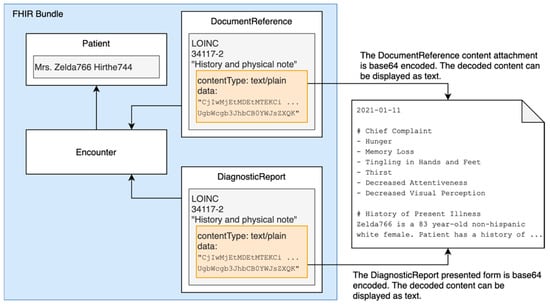 Relationship of FHIR Resources to clinical notes generated during an encounter for a synthetic patient. Rather than external files containing the notes, the notes themselves are Base64 encoded and included within the relevant FHIR resources, as per the FHIR specification.