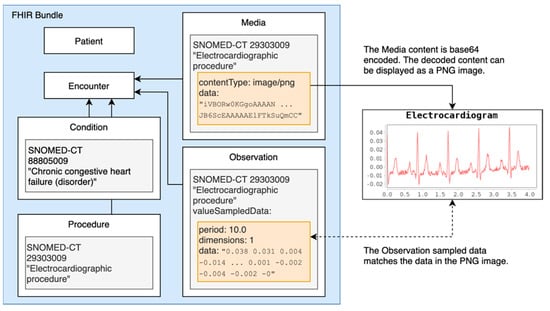 An electrocardiogram and associated observations are added to the synthetic health record of a patient. The relationships between the FHIR Resources and the ECG image are shown, where the image is a Base64 encoded PNG image included within the relevant FHIR Resources, as per the FHIR specification.